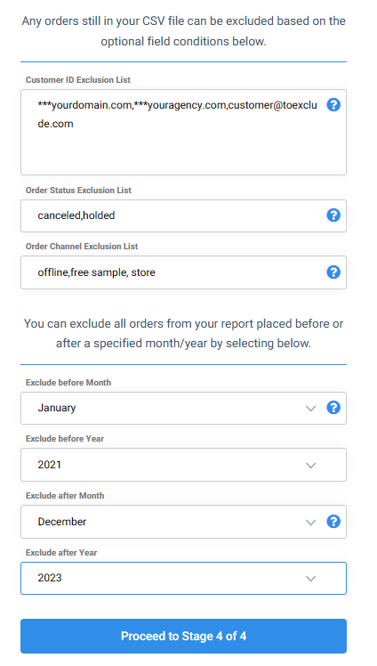 RFM Calc has always had the ability since launch to filter orders based on the Customer ID (including wildcard matches) and Order Status columns, however we have now added a new filter option for Order Channel (e.g. to filter offline orders, although it can be used to filter any column you choose) and also the ability to filter all orders by date. This means you can easily select a time period of orders from your file, rather than reporting on the entire range of uploaded orders.